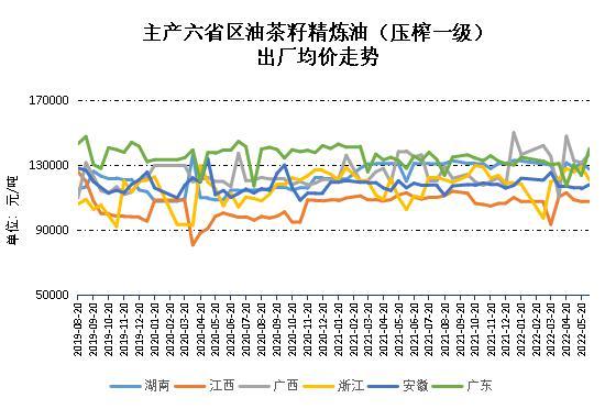 从全国市场看,主产区油茶籽基本售罄,个别企业采购少量油茶籽补库,5月下半月,广东省重点油茶企业含油率在25%以上的油茶籽采购均价报13214.29元/吨,其他省区鲜有交易,报价在16000元/吨至18000元/吨。
